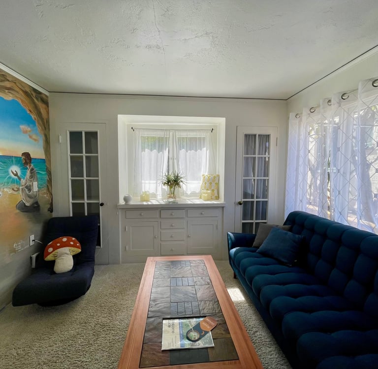 across one with a rather intriguing title: Temple of the Toad and Mushroom: Beachside Abode. Nestled into a quiet corner of the As We Wake community, this property is part of a non-profit aimed at connecting people with nature, health, and unity. The cottage, described as a “ceremonial experience,” features unique decor and vibrant wall art that reflect the spirituality of the community and invites transformation.