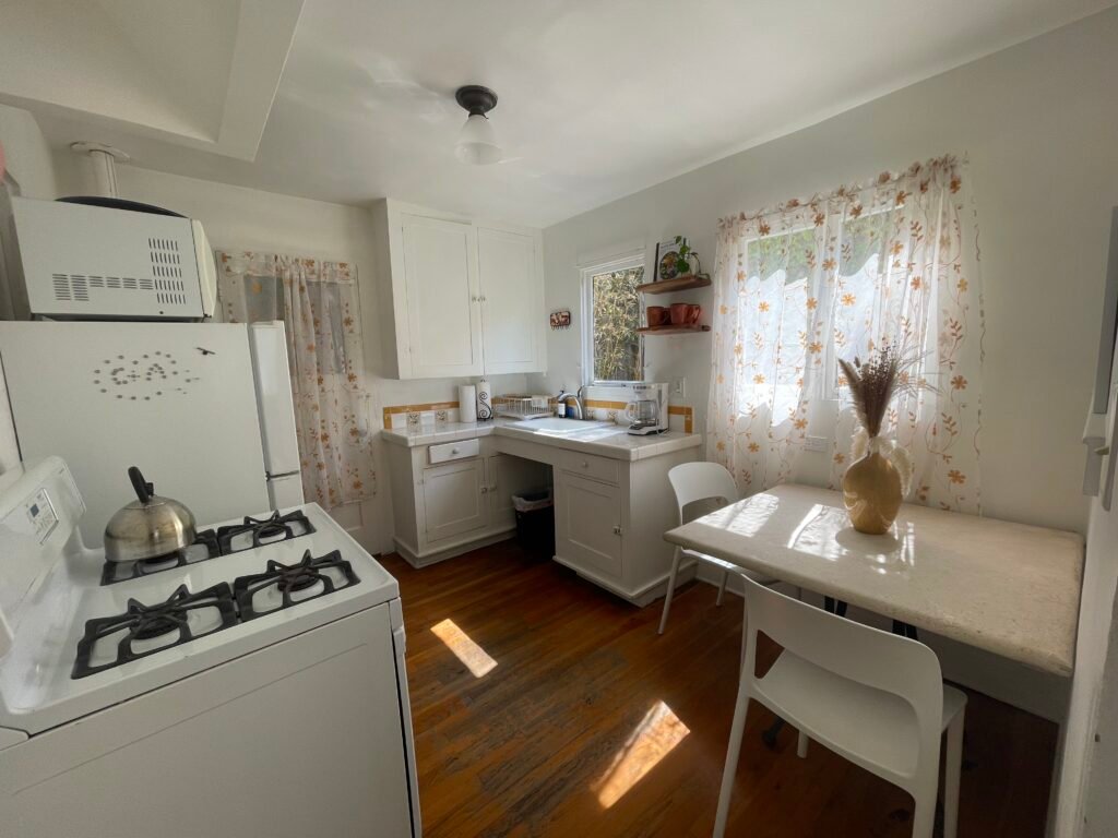 The process was simple. The host was responsive and communicative, and check-in was straightforward — they sent a door code upon booking. The cottage itself is over 100 years old. Its age is visible, but everything was in working order, and it offered all the amenities you’d need for a comfortable stay in the heart of La Jolla: a fully equipped kitchen, a large dresser, and a TV in the bedroom with streaming services like Disney+. There’s even a shared laundry room on-site. To the right of the cottage is a semi-private seating area, perfect for an intimate meal in the sunny San Diego weather.