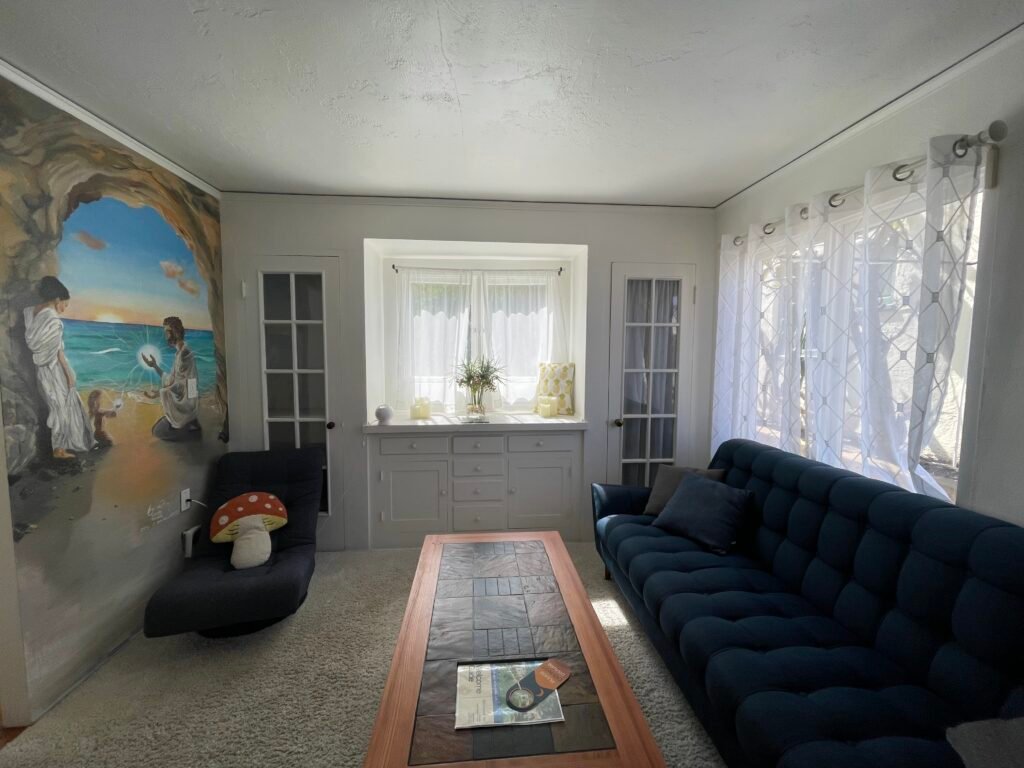 While browsing Airbnb for nearby listings, I came across one with a rather intriguing title: Temple of the Toad and Mushroom: Beachside Abode. Nestled into a quiet corner of the As We Wake community, this property is part of a nonprofit aimed at connecting people with nature, health, and unity. The cottage, described as a “ceremonial experience,” features unique decor and vibrant wall art that reflect the spirituality of the community and invites transformation.